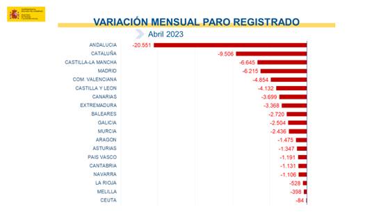 El paro registrado en abril de 2023 baja en las 17 Comunidades Autónomas.