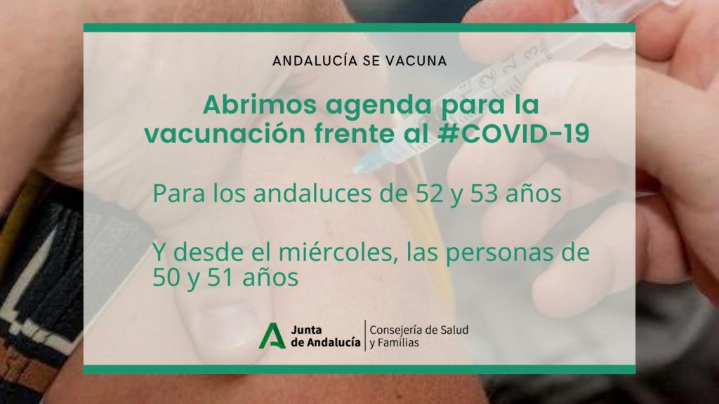 El Servicio Andaluz de Salud (SAS) ha abierto, desde hoy, la autocita para la dosis de recuerdo contra COVID-19 a las personas nacidas en 1968 y 1969 (53 y 52 años). Además, a partir del miércoles, estarán disponibles las agendas para petición de cita previa a las personas nacidas en los años 1970 y 1971 (51 y 50 años).