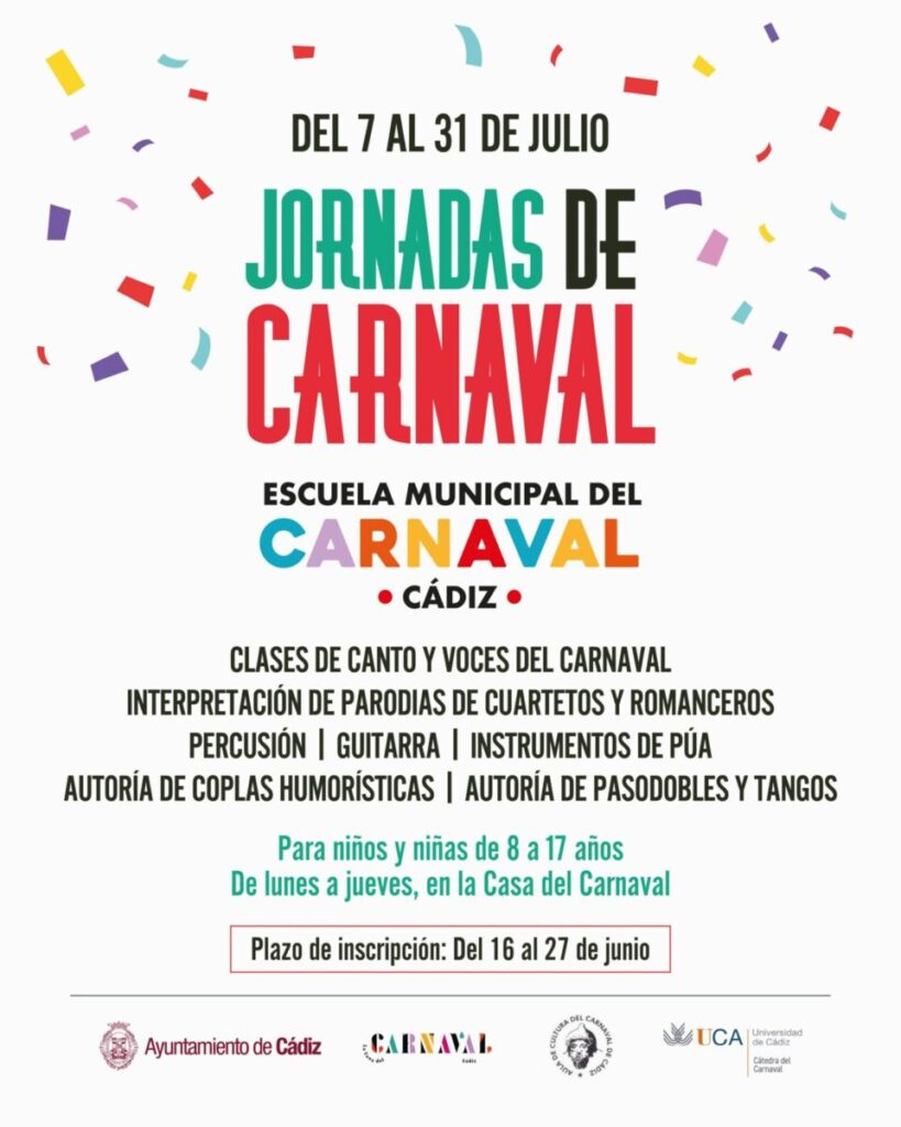 Las jornadas incluyen doce talleres específicos de canto y voces del Carnaval, interpretación de parodias de cuartetos y romanceros, percusión, guitarra e instrumentos de púa dirigidos a menores de 8 a 13 años. Para jóvenes de 14 a 17 años se han programado dos talleres de autoría: uno de coplas humorísticas y otro de pasodobles y tangos.