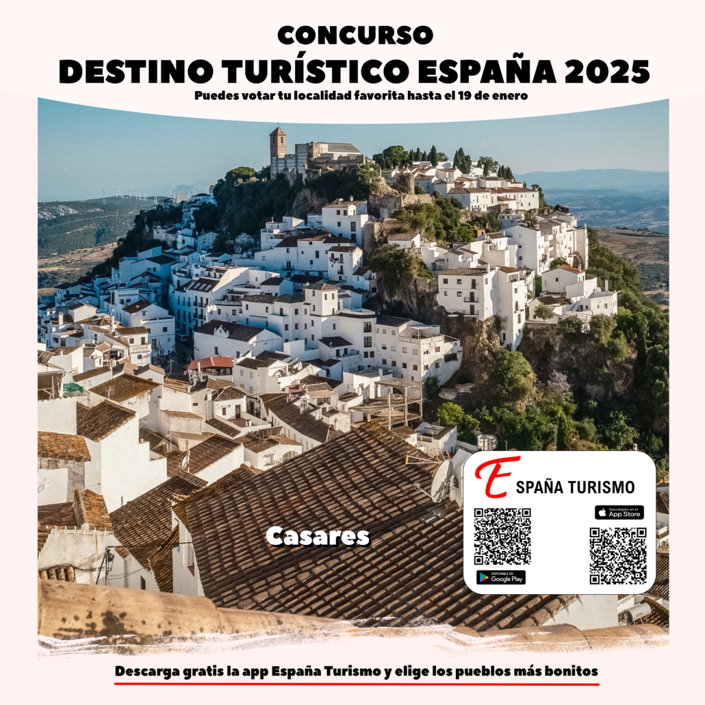 Casares competirá desde esta noche a las 20:00 horas por el título nacional «Destino turístico España 2025» a través de la aplicación España Turismo, tras haber obtenido 4.922 votos que lo posicionaron como el pueblo más bonito de Andalucía. El municipio competirá junto a otros 16 pueblos seleccionados de todas las comunidades autónomas.