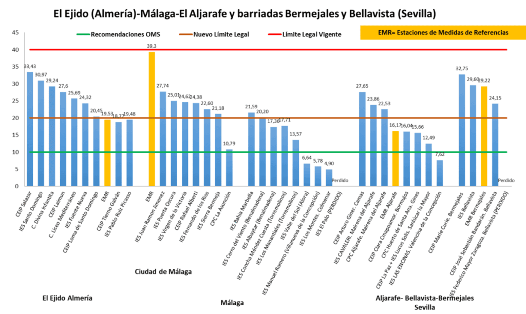 Ecologistas en Acción ha medido los niveles de dióxido de nitrógeno (NO2) en 37 centros educativos de Andalucía —en El Ejido, Málaga capital, varios municipios de la comarca malagueña, el Aljarafe sevillano y las barriadas sevillanas de Bermejales y Bellavista— como parte de una campaña de ciencia ciudadana que abarcó 412 centros de 66 núcleos urbanos en diez comunidades autónomas. Los resultados, recogidos en el informe Calidad del aire en los entornos escolares 2025, indican que el 90% de todas las mediciones realizadas superan los 10 microgramos por metro cúbico (μg/m³) de NO2, umbral que la Organización Mundial de la Salud establece como límite para la calidad del aire.