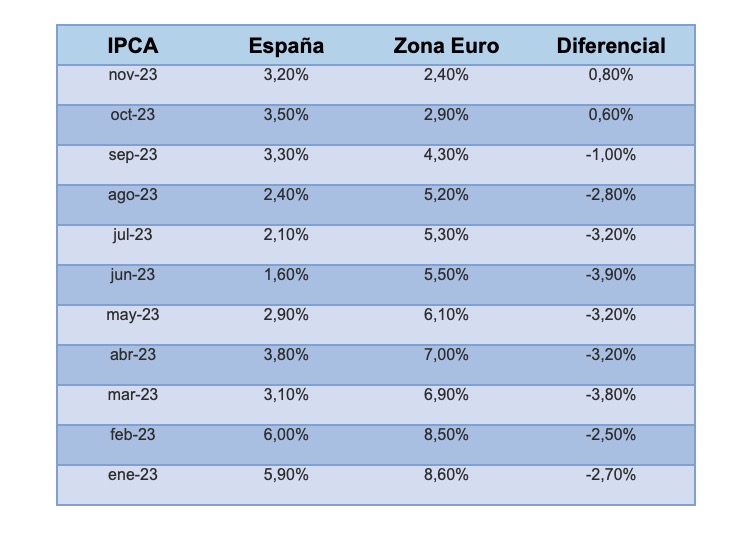 Las tasas de inflación parece que se van controlando tanto en España como en la zona Euro, 3,2 % y 2,4 % en tasa interanual, respectivamente en noviembre. El diferencial a favor de España, con un incremento menor de los precios que en la Zona Euro que se llevaba produciendo desde julio del 22, ha cambiado de signo en octubre y noviembre, debido fundamentalmente a la bajada de precios en Bélgica, (-0,7%) Italia (0,7%), Portugal (2,3%) o Alemania (2,3%) entre otros.