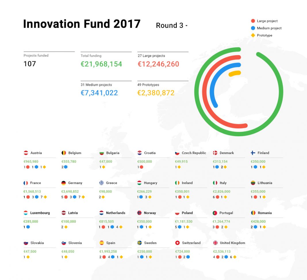 Se han dado a conocer quiénes han recibido financiación en esta tercera ronda: un total de 107 proyectos en 27 países, a los que se va a ofrecer 21.968.154 euros. En esta edición se recibieron un total de 988 propuestas de proyectos de 27 países. De los 107 que van a recibir financiación, 49 se centran en prototipos (proyectos en su primera etapa que precisan hasta 50.000 euros de financiación), 31 son proyectos de tamaño medio (que requieren hasta 300.000 euros de financiación) y 27 son grandes proyectos (que precisan hasta 1 millón de euros financiación).