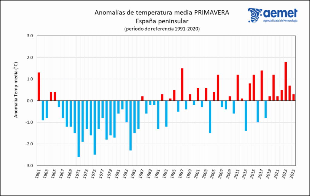La primavera de 2025 ha sido la quinta más lluviosa desde 1961 y la tercera del siglo XXI, con 278,8 mm en la España peninsular, según el resumen climático publicado por la Agencia Estatal de Meteorología (AEMET). Las precipitaciones representaron el 151% del valor normal del trimestre en el periodo de referencia 1991-2020, debido especialmente a las lluvias de marzo.