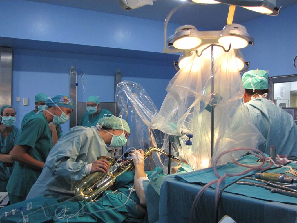 Neurocirujanos, neurofisiólogos, neuropsicólogos, aneste-siólogos y enfermería del Hospital Regional de Málaga han rea-lizado, por primera vez en Europa, una intervención de Neuroci-rugía en la que el equipo de la sanidad pública andaluza hizo un mapeo de la corteza cerebral del lenguaje musical a un paciente de 27 años, al que se mantuvo ‘despierto’ – sin anestesia general – durante toda la intervención, incluida la fase de resección del tumor. Los profesionales emplearon monitorización neurofisiológica intraoperatoria, una técnica que permite ga-rantizar la seguridad del acto quirúrgico, evitando secuelas derivadas del mismo, y para la que se contó con la colaboración del paciente, que interpretó durante algunos momentos de esta singular cirugía piezas musicales con un saxofón, su herramienta de trabajo.