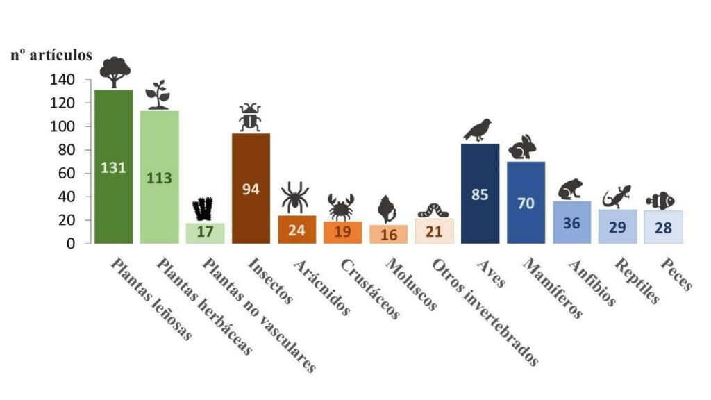 Un equipo de investigación internacional ha demostrado que existen tendencias marcadas en las investigaciones que estudian la biodiversidad de áreas protegidas. Se han encontrado menos publicaciones que estudian plantas que aquellas que estudian animales (41% vs. 59% del total de estudios evaluados, respectivamente), destacando dentro de este último grupo los insectos, los mamíferos y las aves como los animales más frecuentemente estudiados.