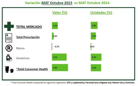 Según ha dado a conocer hmR España, en el mes de octubre de 2015, frente al mismo periodo de 2014, el mercado farmacéutico total crece un 0,64% en valores, con un segmento de marca que pierde un 0,9%, y con unos medicamentos genéricos que crecen un 5,4%, mientras que Consumer Health lo hace al 0,8% (un incremento sensiblemente inferior al presentado en septiembre 3,3%). Sin embargo, la situación es bien distinta al analizar las fluctuaciones por unidades, con caídas del mercado global (-0,9%), de marca (-1,6%) y Consumer Health (-0,8%), siendo los medicamentos genéricos los únicos que presentan datos en positivo, 0,1%