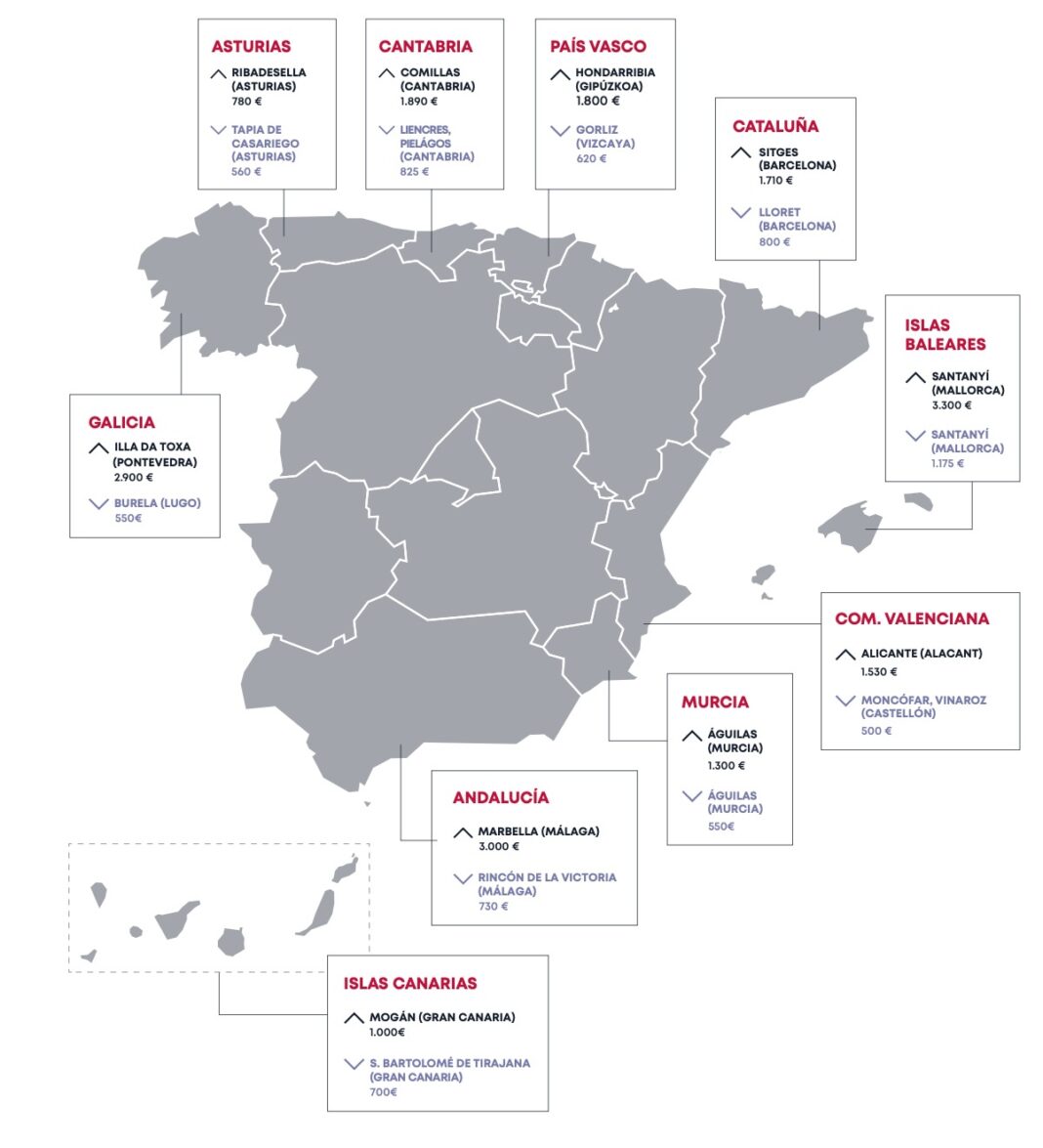 En Andalucía la horquilla también es muy amplia, de casi 2.300 € entre el exclusivo Puerto Banús en Marbella -donde se mantienen los tres mil euros semanales por un piso de 100 m2 hasta los 730 € del Paseo Marítimo del Rincón de la Victoria, también en la provincia de Málaga, o los 750 € semanales de la primera línea de playa en Almería capital.